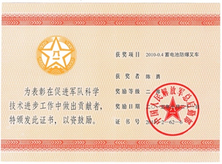 近日,浙江佳力科技股份有限公司與總后勤部建筑工程研究所共同開發(fā)研制的 “2010-0.4蓄電池防爆叉車”項目,榮獲軍隊科技進步獎二等獎。我公司總工程師陳勇以項目負責(zé)人之一的身份,加入該項目研制的項目組,成為重要的項目完成者之一,榮獲軍隊科學(xué)技術(shù)進步獎二等獎。