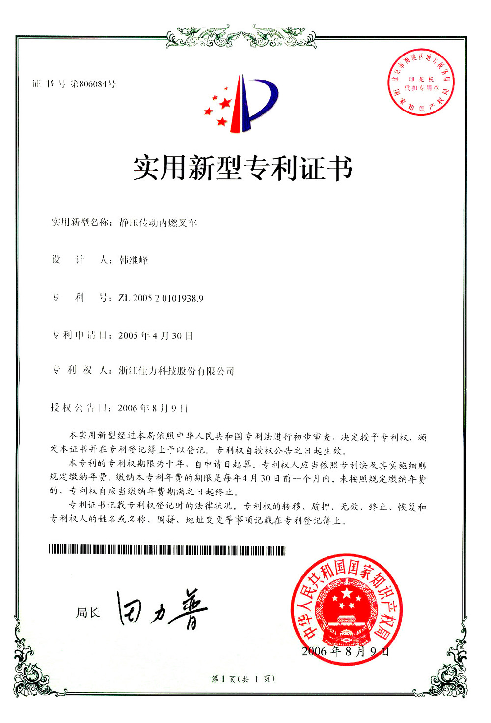 實(shí)用新型專利證書(shū)