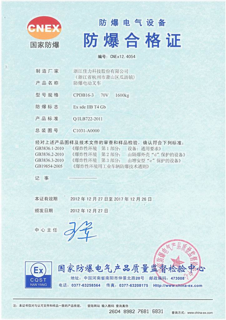 CPDB16-3 防爆電動叉車三支點氣體證書